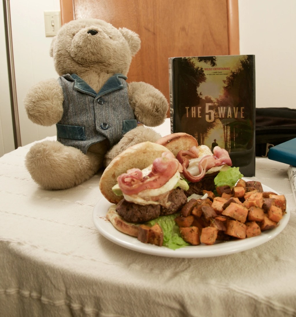 “…on the fourth day he comes into the room with an honest-to-God hamburger on a hot, homemade bun and a side of roasted potatoes. It’s the first real food I’ve had since escaping Camp Ashpit. It’s also a freaking hamburger, which I haven’t tasted since the Arrival and which, I think I’ve pointed out, I was willing to kill for.”