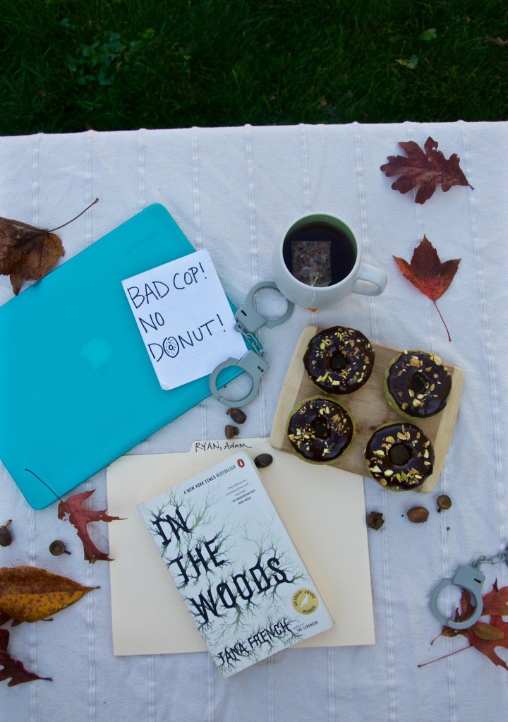 Besides plastic-y warm chicken sandwiches and lots of whiskey, this book didn’t offer much in the form of food inspiration. So I followed the line of Cassie’s bumper sticker and made some woodsy-Halloween-y donuts with an earthy, green base and a rich, chocolate glaze.
