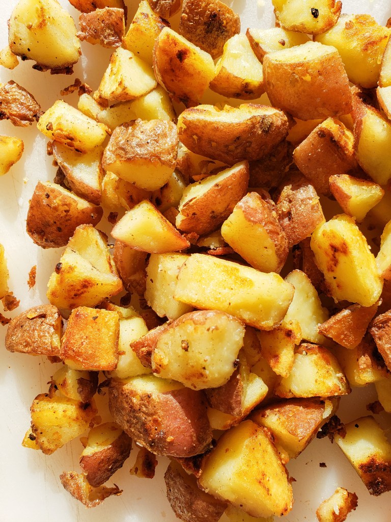2. Dice the baked potatoes. If you prefer, it’s fairly easy to remove the peel at this point. I leave it on depending on the variety of potato I’m using. Toss the diced potatoes with garlic powder, salt, and pepper.