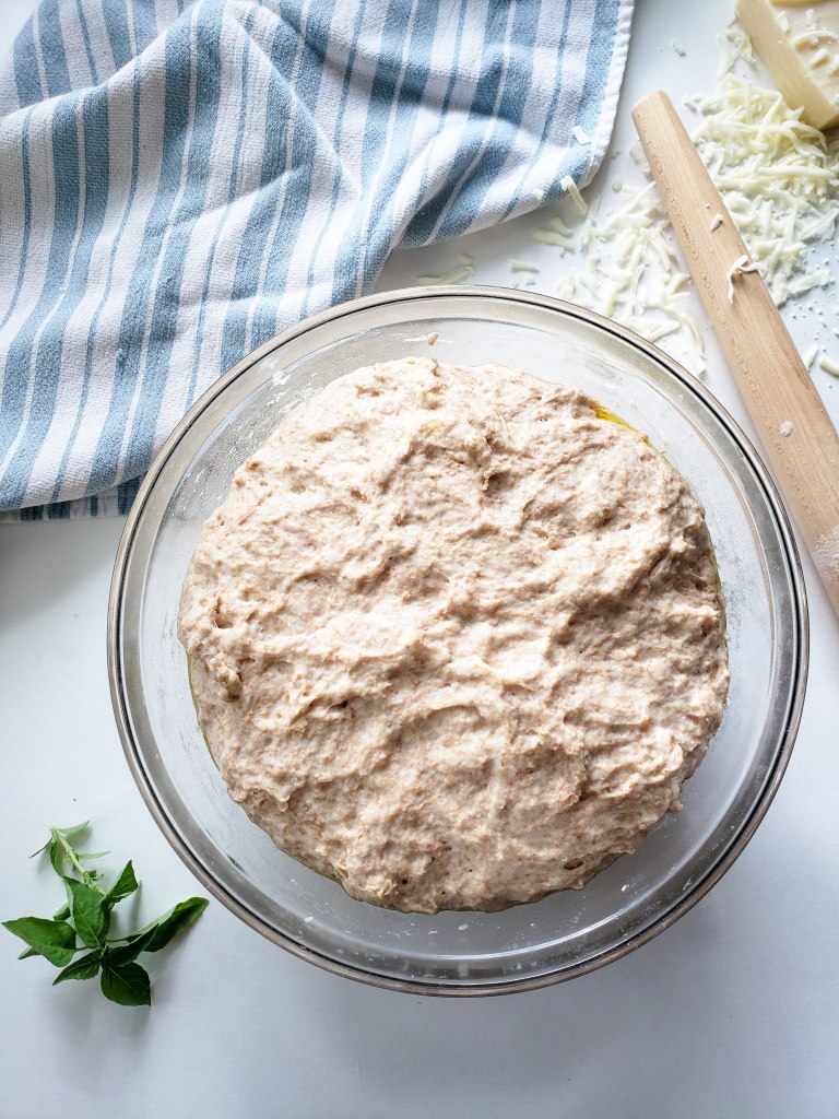 All the other ingredients get dumped into the bowl. The honey adds a nice sweetness and balance to this dough. I mix it with one of my favorite gir spatulas. Either a regular sized one or this jumbo one. Because the dough is so sticky, I use the spatula to kneed it. If I’ve got the time, I’ll kneed it for about 10 minutes. If I’m in a rush, I’ll kneed it for 2 minutes. It always come out just fine.