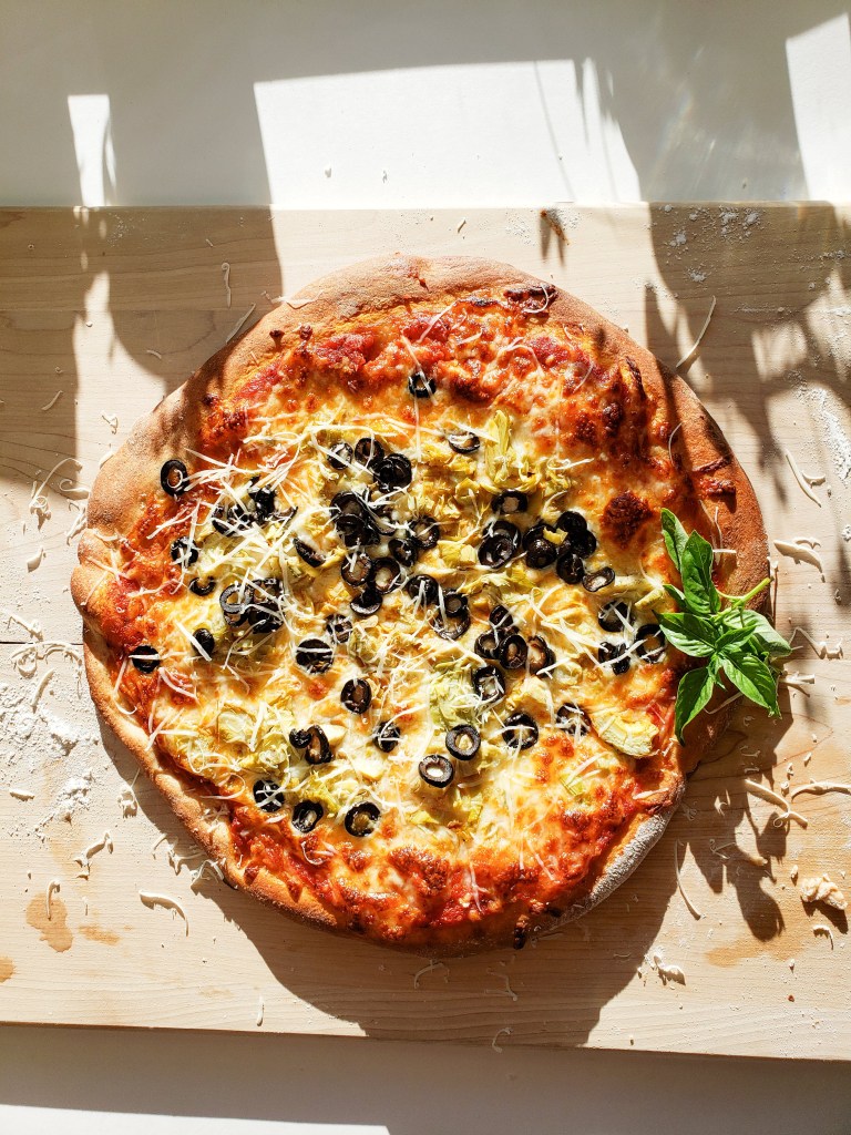 While we typically keep our pizza pretty basic with turkey pepperoni, we also like olives and artichoke hearts; black olives, mushrooms, and pepperoni; Hawaiian. I’ll also occasionally make a fancy pizza crust by mixing a bit of olive oil, a pinch of salt, a pinch of garlic powder, a pinch or oregano, and a pinch of basil in a ramekin. I’ll then brush the mixture on the outer crust of the pizza before baking.