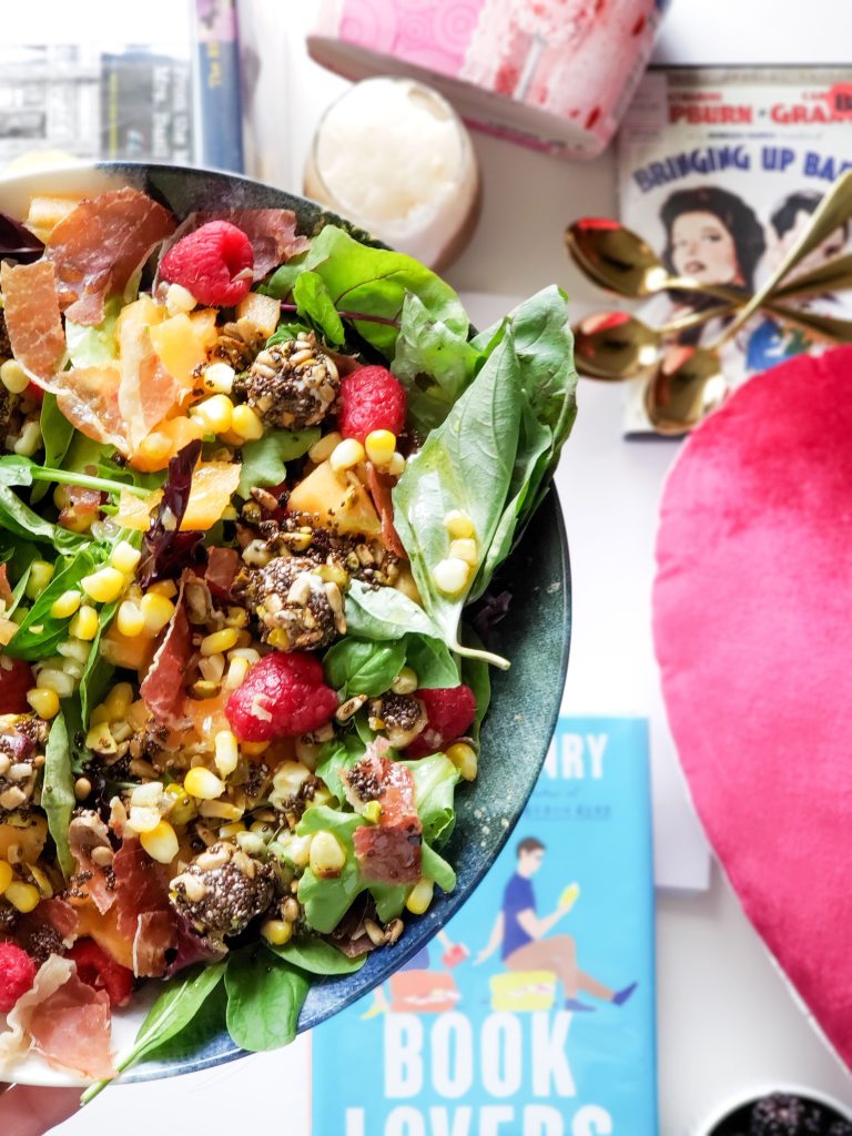 I knew I had to make a goats salad since Nora was constantly ordering one or thinking about one. I made this amazingly delicious salad from Half Baked Harvest. I diced up my cantaloupe and crisped the prosciutto.