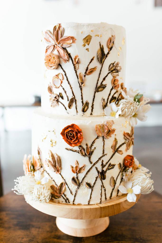 And I also made a two-tier chocolate cake with layers of ganache, peanut butter buttercream, and graham chocolate crumbles. This cake weighed a ton and spoiler–we had way too much cake for the wedding! For the cake design, I used palette knives, which is such a fun cake decorating method!