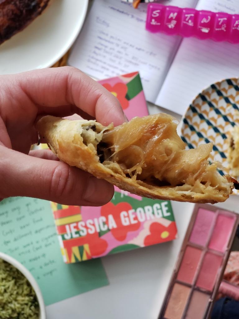 I had to recreate the lunch Maddie has with one of her friends. Maddie is in a particularly rough patch, and her friend, knowing Maddie needs to eat, takes her out for lunch. They have half a roast chicken (I used a rotisserie chicken), green rice, sweet potato fries (I baked frozen fries), and caramelized onion and mushroom empanadas.