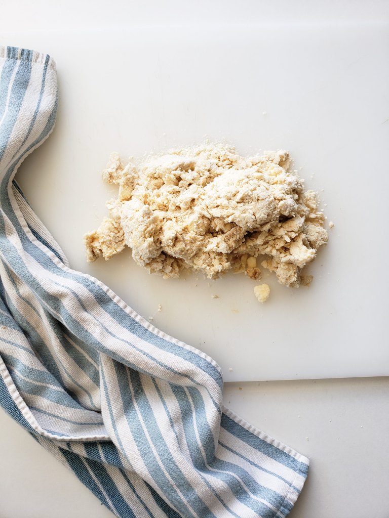 A word of caution when mixing the scone dough–do so gently and don’t overmix. As you can see in the photo above, the mixture is still a bit dry when I dump it onto the board. From here I’ll need it just a few times to get all the crumbs. The less the dough is handled, the better!
