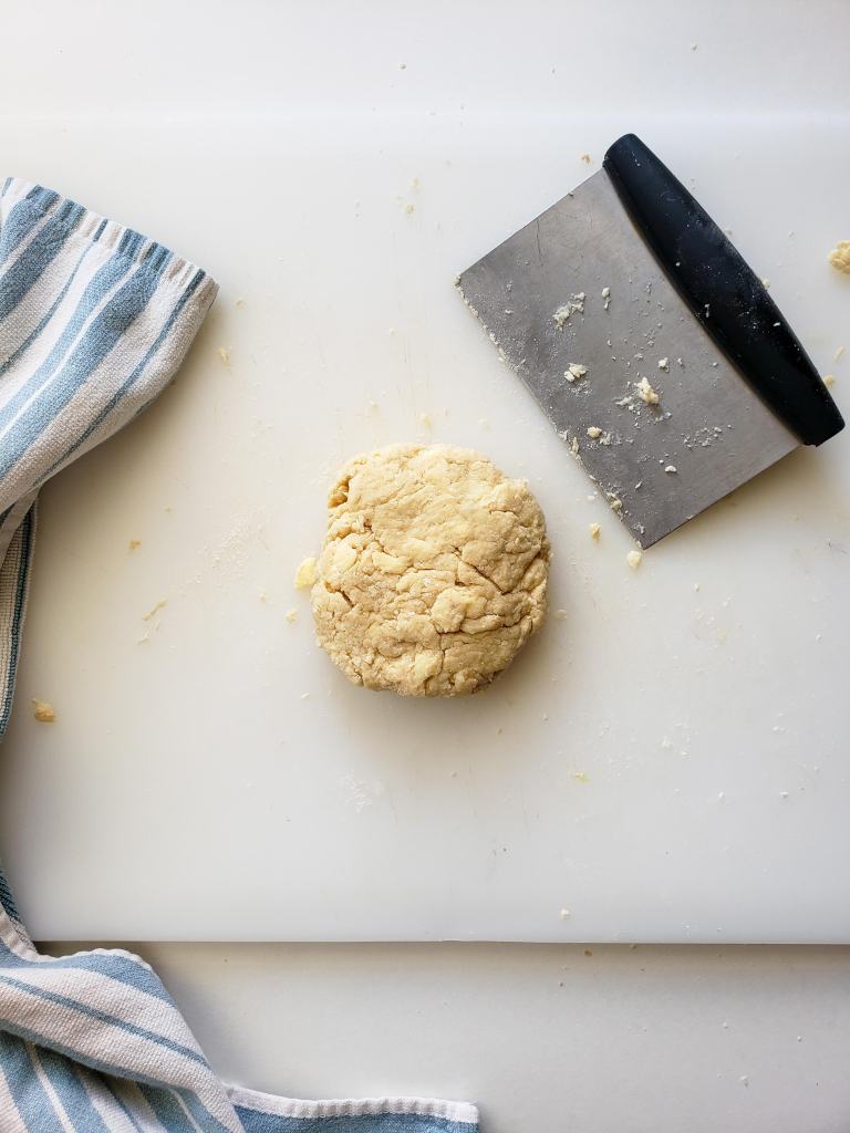 - Gently combine the dough into a ball and then flatten into a 7-inch disk. You can cut the disk into 8 triangles or use a round cookie cutter to cut out the scones. Place the slices onto the parchment lined baking sheet, leaving space between each slice.