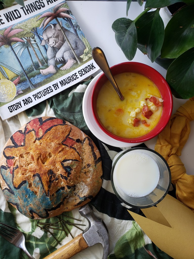 I painted a loaf of bread to match the inside cover of Where the Wild Things Are by Maurice Sendak, and then created Max’s dinner with bread slices, a glass of milk, and a bowl of soup.