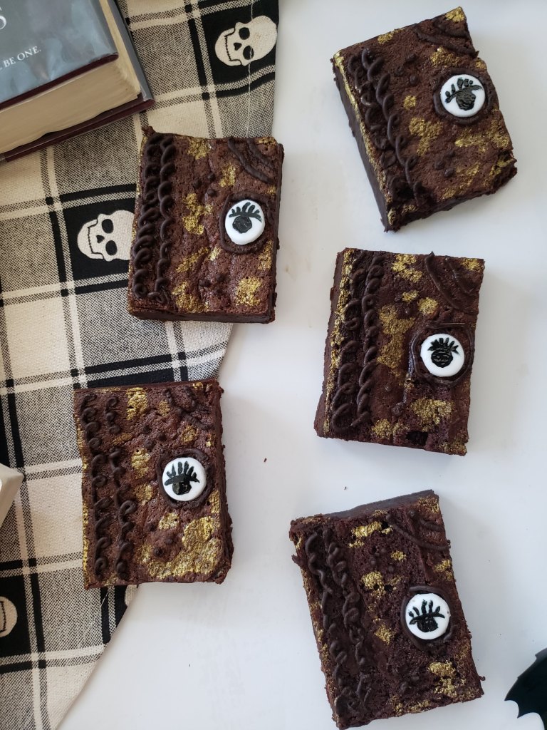 For these spell book brownies, I made my favorite brownie recipe and then copied this picture from Mike Bakes NYC. I piped ganache for the little details. For the eyes, I cut circles out of white fondant with piping tips and then painted the eyeballs with black gel food coloring and my food paint brushes.